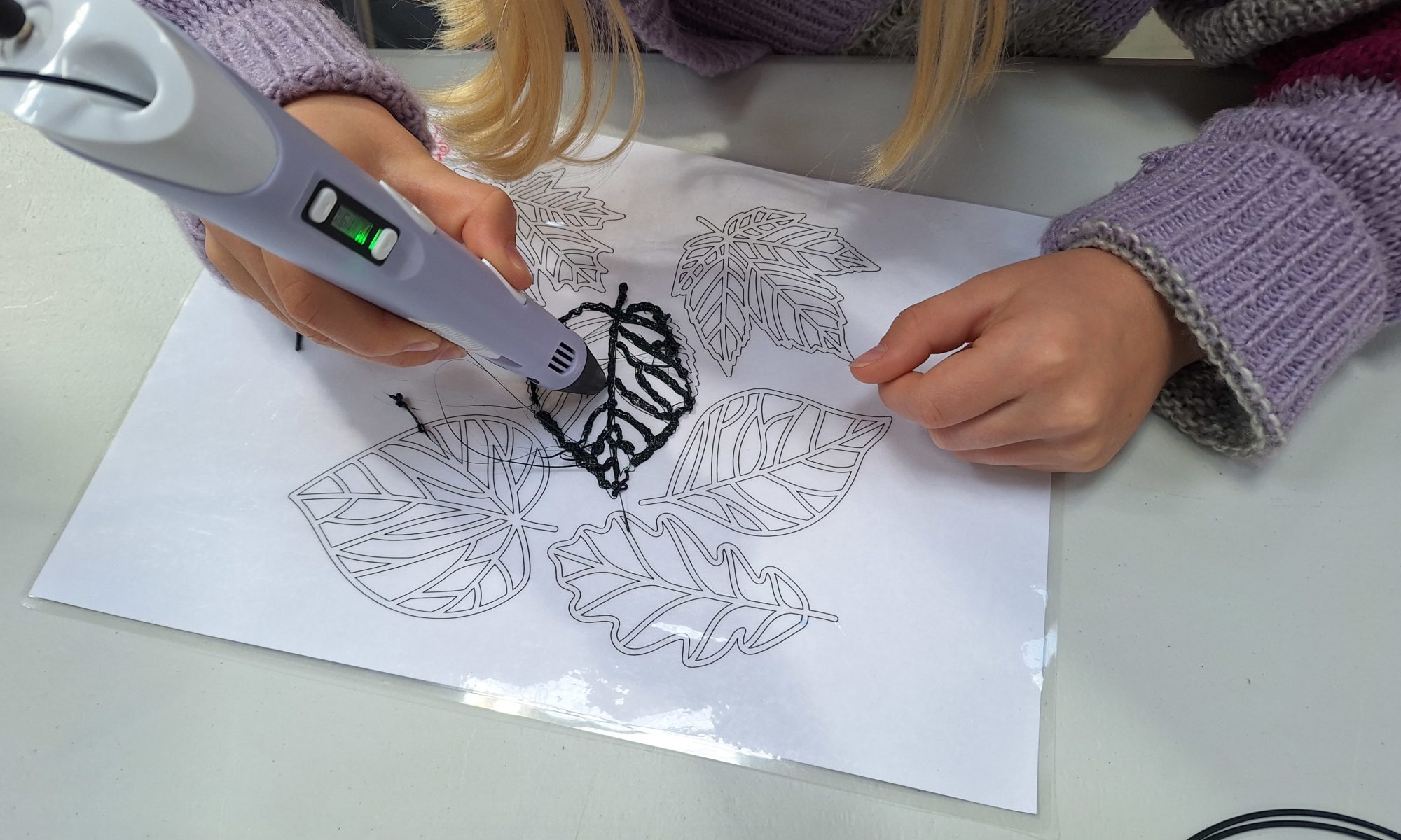 Na Půdě požádejte obsluhu o zapůjčení 3D pera a šablon, podložky. Šablonu s listy najdete zde.